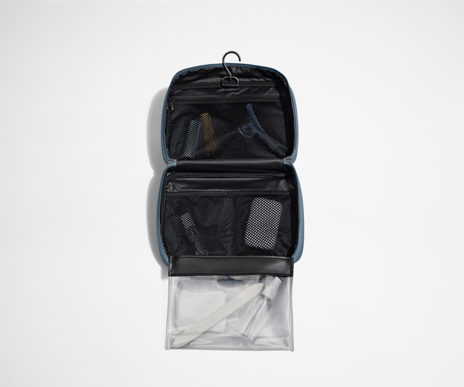 The Hanging Toiletry Bag is made with water repellent nylon and a coated spill-proof interior. It's thoughtfully designed with a small hook so you can hang it on a door or wall, contains three mesh pouches that provide easy storage and convenient access to your favorite travel essentials, and includes a clear, removable pouch for smaller items or liquid products.